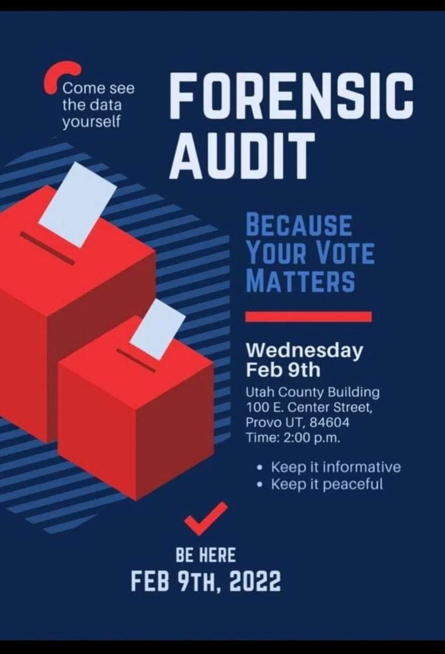 Utah County residents, come to the Forensic Audit at the Utah County Administration Building at 100 E Center St in Provo on Wednesday, February 9, 2022, from 2:00 - 4:00 PM. Come see the Utah County election data anomalies for yourself. Don’t miss this informative, peaceful presentation! Your vote matters!